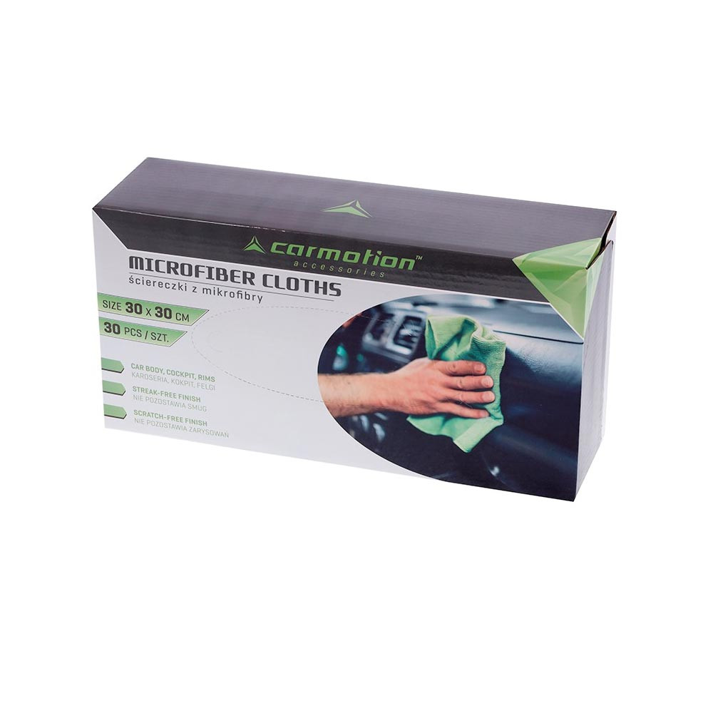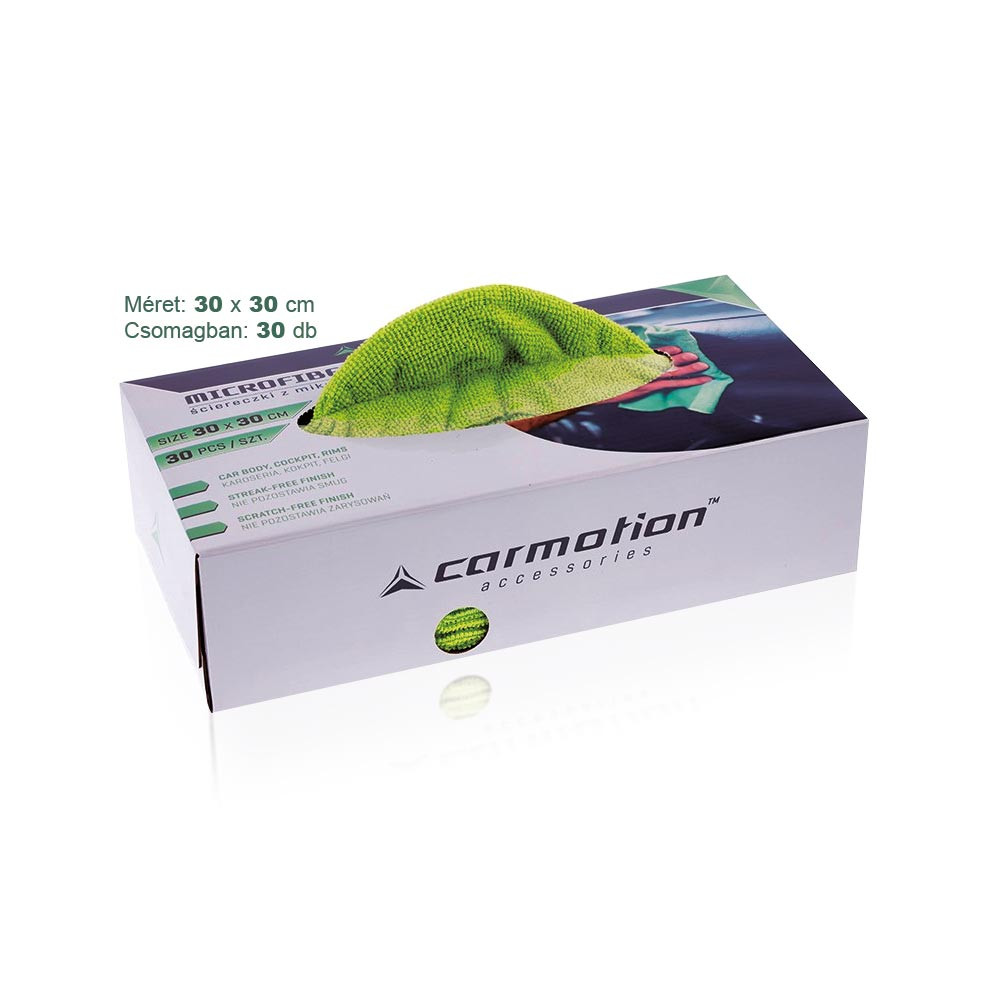 30 db sokoldalú mikroszálas kendőből álló készlet egy ergonomikus papírdobozból. Az autó belsejének és külső elemeinek tisztítására.