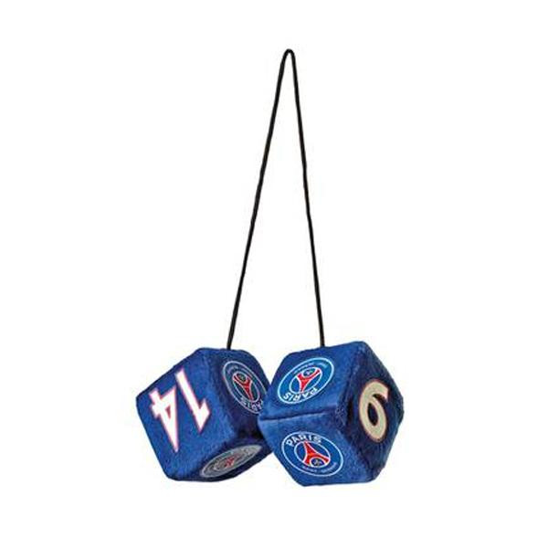 A francia PSG csapat logójával és színeivel ellátott plüss dobókocka akasztóval.